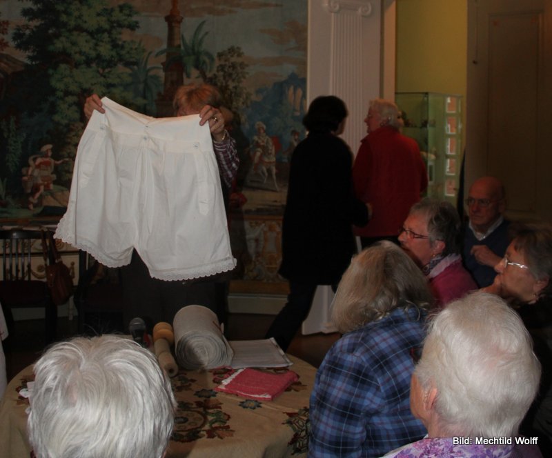 Das dritte Treffen der Textilwerkstatt beendete Mechtild Wolff mit der Geschichte über die repräsentative „Villa Sophia“, die Eduard und Sophia Wiemann 1870 am Emstor erbauen ließen und zu einem kulturellen Zentrum entwickelten, in der Musik und Literatur der Klassik und Romantik gepflegt wurden. Mit dem Abriss der „Villa Sophia“ hat Warendorf ein unwiederbringliches Zeugnis der Industrialisierung verloren.