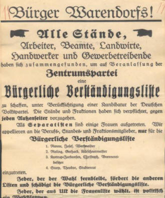 Die Zentrumspartei hat sich mit anderen Parteien auf eine „Bürgerliche Verständigungsliste“ geeinigt. Die Kandidatenaufstellung erfolgt nach berufsständischen Gesichtspunkten, die Listenplätze sind schnell besetzt.