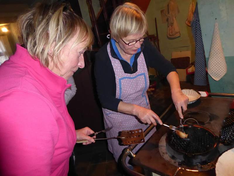 Hundert Jahre ist das Waffeleisen alt, mit dem die Damen vom Heimatverein Warendorf auch dieses Jahr wieder am 1. Advent für die Besucher des Gadems Waffeln buken (backten). Und den ganzen Sonntagnachmittag kamen die Besucher, viele Familien mit Kindern, und staunten über das alte Waffeleisen, das auf dem offenen Feuer des Küchenherdes erhitzt und für jede Waffel mit Speck neu eingefettet wurde. Der Teig wurde in das Eisen gegeben und dieses dann jedes Mal gedreht, das Backwerk so schön gleichmäßig gebräunt. Marie-Luise Mönnigmann, Sabine Czwalina, Johanna Ortmann, Magda Hülsmann, Ruth Schulze-Zurmussen und Ulla Stake waren den ganzen Sonntagnachmittag im Einsatz, um zusammen mit Muckefuck, echtem westfälischen Roggenkaffee, diese westfälische Köstlichkeit den Gästen zu servieren. Diese kamen zahlreich, genossen gerne die Süßigkeit am Sonntagnachmittag und den Charme der Atmosphäre des kleinen Lokomotivputzerhäuschens.