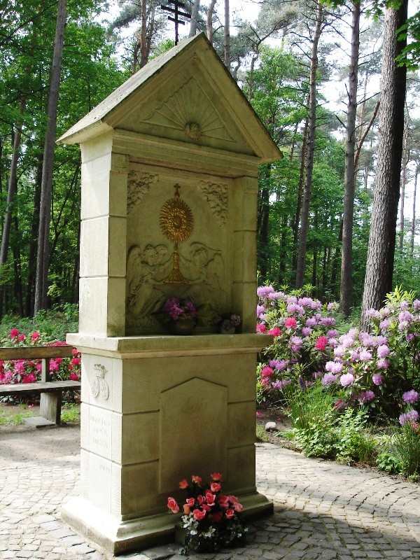 Von dort ging es zur nächsten Station am Wegkreuz des Hofes Austermann und dann zum Stationsbild "Brot der Engel". Hier sieht man eine Abbildung wie auf dem Epitaph: Monstranz mit dem Allerheiligsten und zwei Engel, die darauf hinweisen. Auch dieses Standbild wurde um 1760 geschaffen. Das Bild der Monstranz ähnelt in beiden Abbildungen der alten Monstranz von St. Marien.